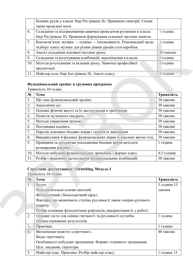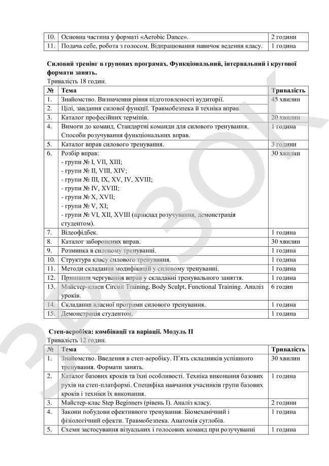 Курси охоплюють такі напрями: персональний тренінг, робота в тренажерному залі, групові програми, реабілітація, функціональний тренінг, анатомія та методика тренувального процесу. Заняття проводять сертифіковані спеціалісти з практичним досвідом роботи у фітнес-клубах та спортивних центрах.